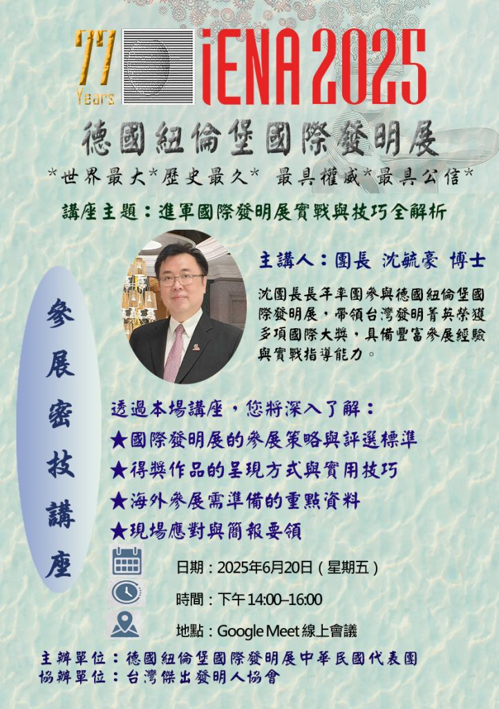《參展密技講座》訊息公告 / 2025 年 6 月 5 日 iENA 德國紐倫堡國際發明展,是全球首創且歷史最悠久的創意發明展,每年吸引來自世界各地的參展者,享有國際最高 《參展密技講座》 閱讀全文 »